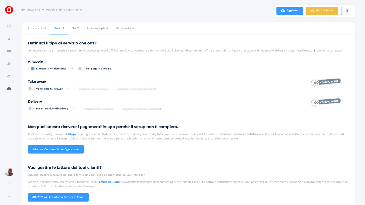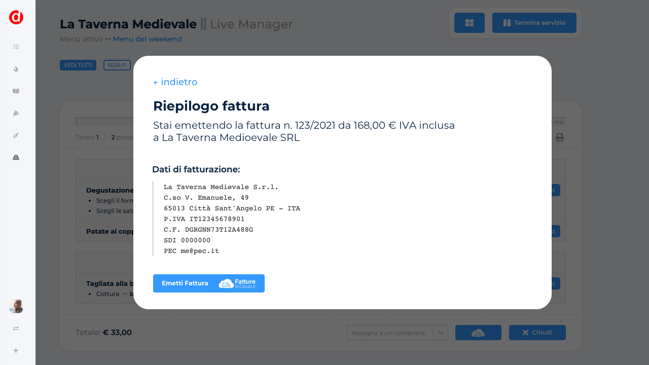 Grazie all'integrazione con Fatture in Cloud potrai mandare le fatture ai tuoi clienti direttamente dal punto cassa di Dishup.Accedi a Dishup nella sezione dei servizi attivi per il tuo ristorante e clicca su Accedi con Fatture in Cloud per attivare i servizi di fatturazione sul tuo punto cassa. Scopri tutte le funzionalità di Dishup su https://dishup.it