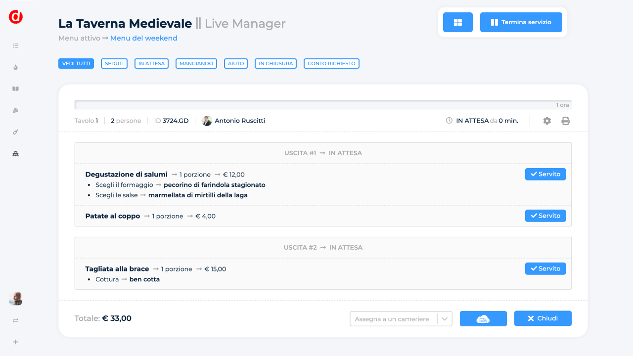 I tuoi clienti possono vedere il menu e ordinare velocemente. Bastano pochi secondi per ordinare e pagare al ristorante. Sicuro. Comodo. Veloce. Offri ai tuoi clienti un’esperienza momorabile. Basta un QRCode per consultare il menu, ordinare e pagare. Sfrutta al massimo i vantaggi del tuo menu digitale: facile da configurare, aumenta la visibilità dei piatti, migliora l'efficienza del personale, accetta pagamenti al tavolo. Migliora l’efficienza Dishup Waiter. l personale di sala avrà il pieno controllo dei tavoli e dei tempi di servizio.