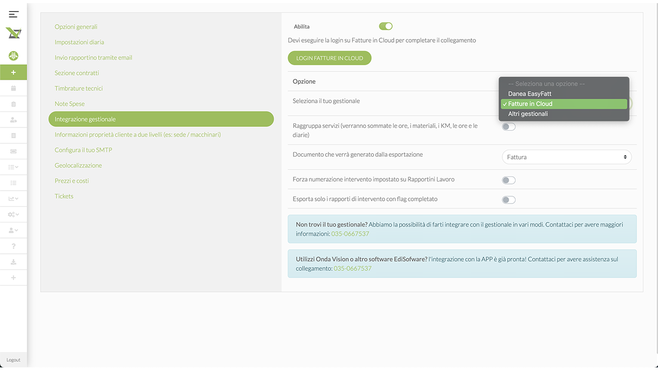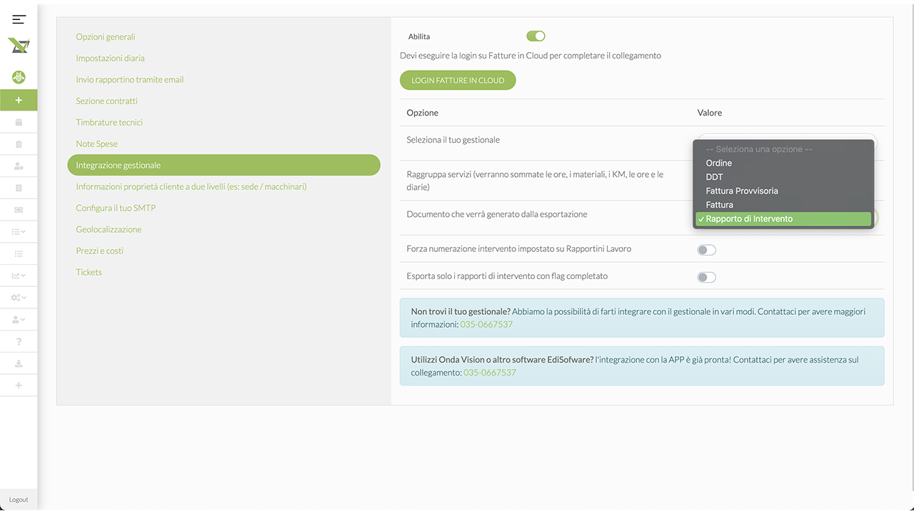 Se hai bisogno di aiuto per integrare RapportiniLavoro con fatture in cloud, contattaci! Un operatore ti aiuterà per farlo senza costi aggiuntivi.