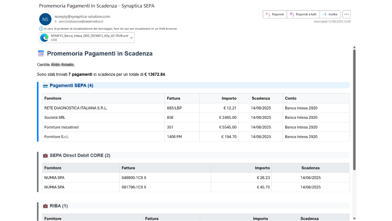 Risparmio totale di tempo per l'inserimento di bonifici di pagamento o RiBa di incasso in home banking, promemoria personalizzati su periodi di tempo scelti dall'utente (esempio: preparami tutti i pagamenti in scadenza nella prossima settimana).
