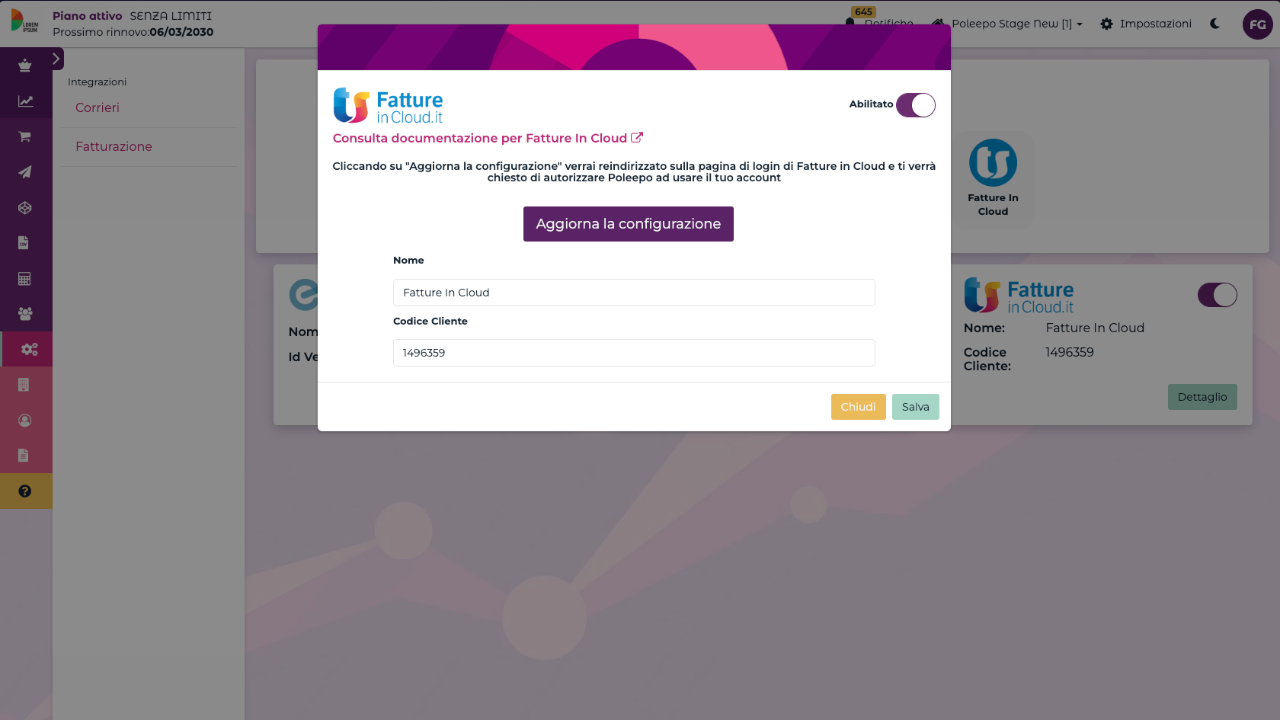 Una volta inseriti i dati richiesti clicca su "salva" per salvare la configurazione e abilitala, tramite il flag in alto a destra per poter iniziare a generare le fatture dei tuoi ordini con Fatture in Cloud. Informazioni: chiedi@poleepo.cloud