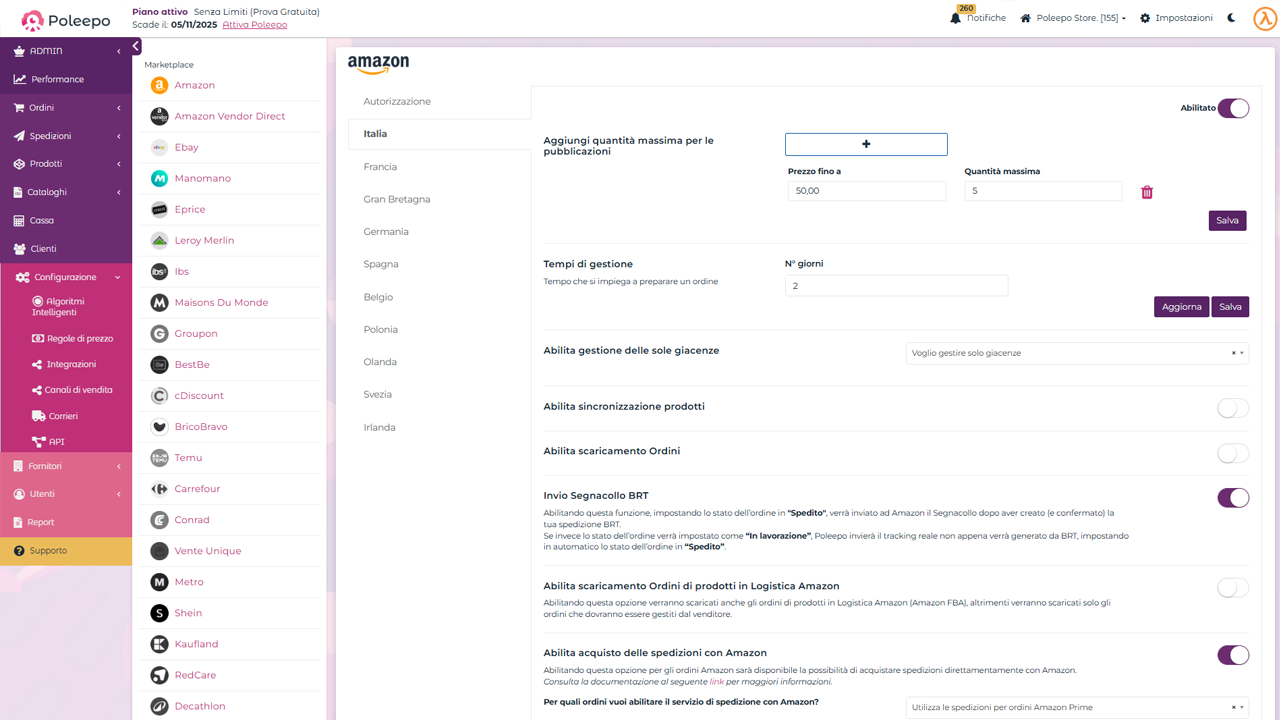 Poleepo è una piattaforma cloud che semplifica la gestione delle vendite multicanale. Consente ai venditori di centralizzare prodotti, ordini e spedizioni in un unico ambiente, evitando la necessità di gestire processi separati su ciascun marketplace o sito e-commerce.