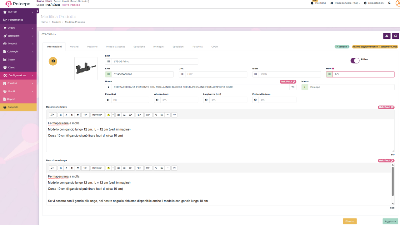 Con Poleepo puoi gestire un catalogo unificato, sincronizzando automaticamente prezzi, descrizioni e disponibilità su tutti i canali di vendita. Questo riduce gli errori e garantisce dati sempre aggiornati e coerenti.